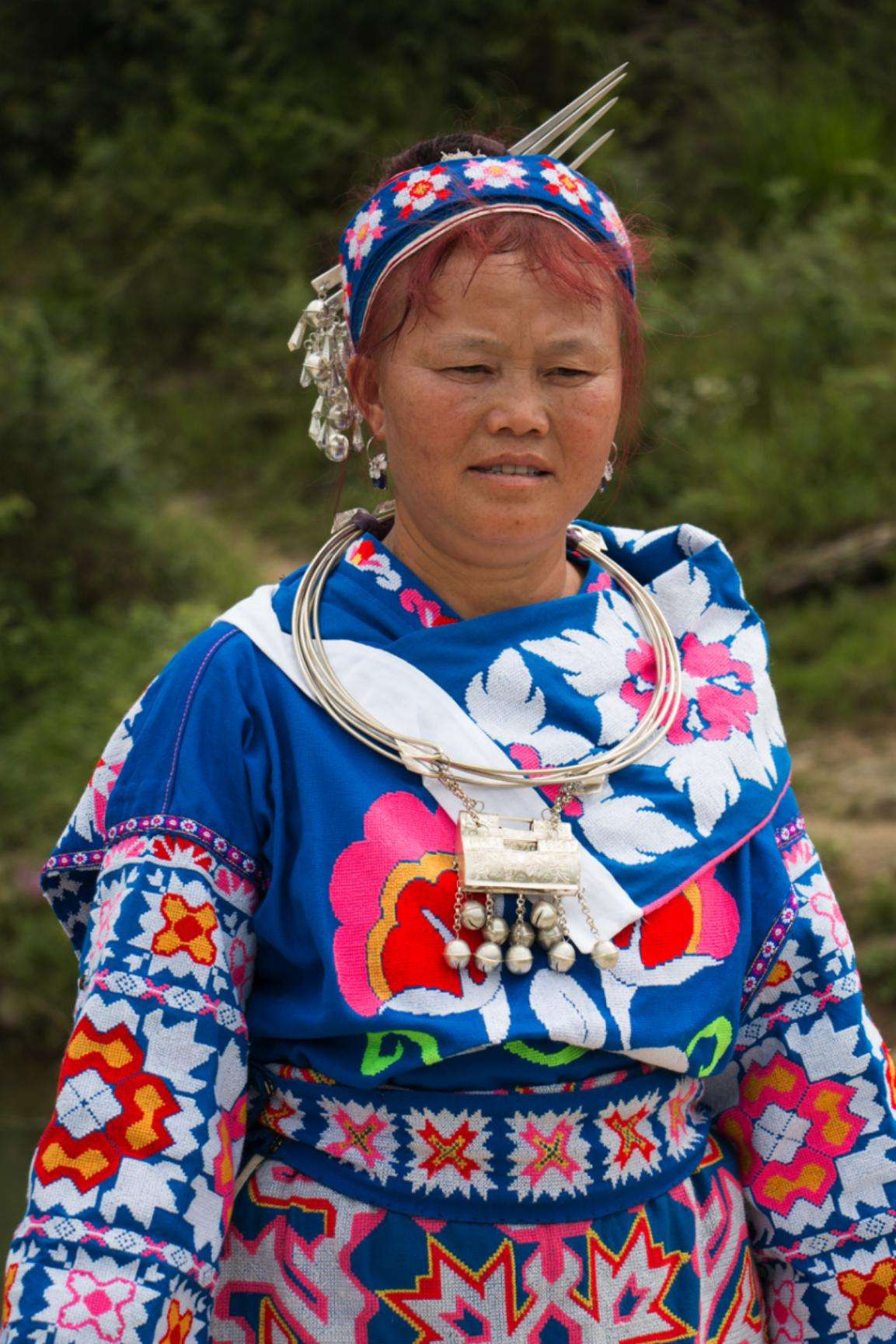 谷立村苗族女性服飾顏色花哨,款式新穎。女子一般頭戴絲帕裹成的帽子,帽子顏色主要為藍色,上面繡有花朵圖案作為裝飾。頭飾除了戴帽子,還佩戴有銀飾發(fā)簪,發(fā)簪數(shù)量一般為4根,發(fā)簪底部焊接有銀鈴鐺作為裝飾。上身主要穿著藍色打底的翻領(lǐng)長袖上衣,衣服上有大面積刺繡圖案,刺繡圖案內(nèi)容豐富,兩袖同樣也有大面積刺繡圖案,圖案以花草、幾何居多。女子胸前還佩戴有銀飾,銀飾主要為銀圈和銀鎖,在銀鎖下方還焊連有銀鐺作為裝飾。女子主要以藍色打底的百褶短裙和圍腰為主,百褶短裙上繡有花紋圖案作為裝飾。圍腰上的刺繡圖案面積大且內(nèi)容豐富,圖案整體成幾何狀,幾何圖案內(nèi)又繡有花草圖案,圍腰下部繡有花紋描邊和串有珠簾作為裝飾。女子在小腿處還綁有藍色打底的護腿套,護腿上繡有花朵圖案。