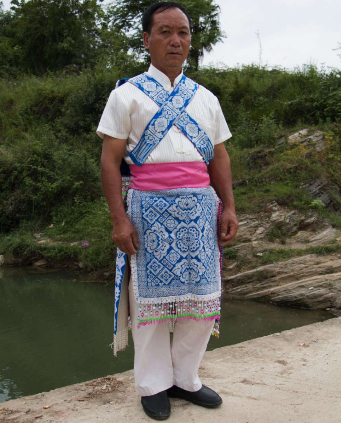 谷立村男子服飾相對于苗族女子服飾則顯得較為簡樸,男子上身主要穿著白色打底的對襟衣,身后背有背牌,背牌底色為藍色,上繡有花朵圖案作為裝飾。下身主要以藍色打底的圍裙為主,身前圍裙,上面布滿刺繡圖案。身后的圍裙則為一條條獨立的絲帶,絲帶上同樣布滿花紋刺繡圖案,在其底部還串有珠簾作為裝飾。