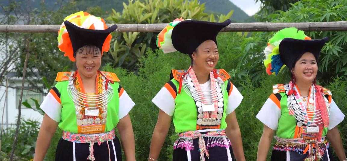 五星村苗族女性服飾顏色亮麗,做工精細(xì)。女子頭戴黑色百褶帽,百褶帽形似一只船,在其尾部還裝飾有用絲巾制作而成的花朵。上身則多以黃綠色打底的對(duì)襟短衣,對(duì)襟處繡有花紋圖案作為描邊,對(duì)襟上裝有銀飾圓牌。女子胸前還大多佩戴銀項(xiàng)圈,身后則穿戴背牌。背牌做工極為精細(xì),刺繡圖案豐富。圖案多以幾何和花草為主,背牌上部裝飾有兩排對(duì)稱的銀牌,左右也裝飾有對(duì)稱的銀鎖。背牌中部是一個(gè)倒三角銀飾,銀飾上雕刻有蝴蝶圖案。女性服飾下裳主要分為三個(gè)部分,底部為黑色打底長(zhǎng)褲,中層為黑色打底的百褶裙,上層則為黑色打底的圍腰。圍腰底部繡有花紋圖案裝飾,圖案內(nèi)容多以花草為主。腰部系有腰帶,腰帶上刺有花紋圖案且顏色較為鮮艷。女性服飾身后還垂有四條絲帶,絲帶上也繡有大面積的花紋圖案,服飾整體充滿民族氣息。