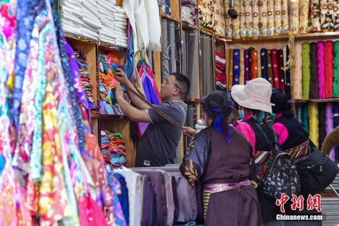 圖為7月24日,幾位藏族婦女在拉薩老城區(qū)八廓街上的藏裝店內(nèi)選購(gòu)藏裝。 中新社記者 貢嘎來(lái)松 攝
