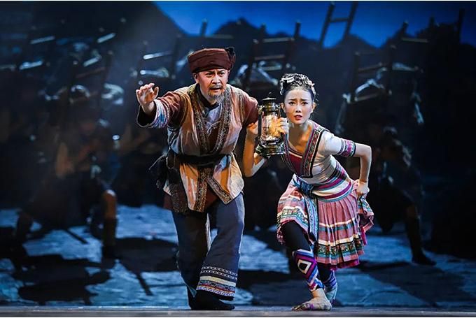 “花腰帶”既是精美的舞蹈道具,又是劇中人物情感的寄托,在整部舞劇中反復(fù)出現(xiàn)。特別是在雙人舞中,“花腰帶”將人物間無形的關(guān)系幻化成有形的聯(lián)系。劇中的蘆笙舞段,不僅僅是男女之間情愛的表達(dá),更突出表達(dá)了“開山人”為了讓窮鄉(xiāng)告別貧苦,為大愛舍小愛、努力奮斗的決心,以及對美好生活的向往。傳統(tǒng)民族舞蹈在這部劇中被賦予了不同的含義。
