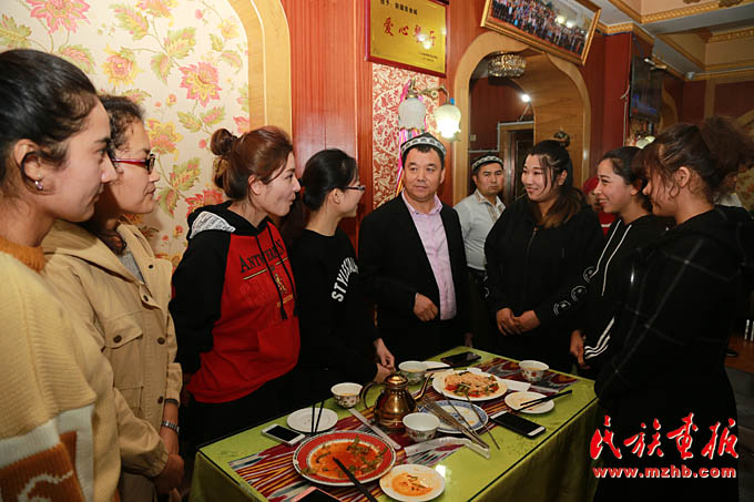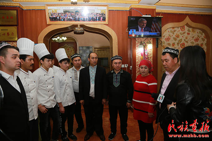 新疆美食城店主阿地力·買買提帶領維吾爾、哈薩克、回族等員工學習十九大報告