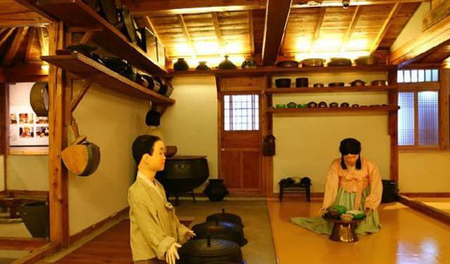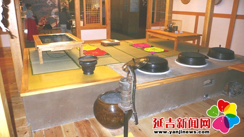 在傳統(tǒng)的朝鮮族民宅中,炕和鍋臺是平齊的,需要燒火做飯時,主婦會打開架在柜臺一側(cè)的移動木板,下到地面水平線以下的“灶坑”點(diǎn)火做飯。傳統(tǒng)的炕采用長筒式結(jié)構(gòu),煙火由一洞內(nèi)循環(huán)排出,使每洞都有煙火串入,炕即溫?zé)?。朝鮮族的火坑高度為30-40厘米,但炕洞向下挖入,炕面抹白灰,表面糊油紙或鋪草簾子,炕面平整。隨著物質(zhì)條件的改善,炕面改鋪纖維板或者地板膠,既美觀又耐用。