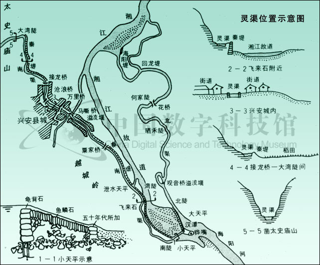 靈渠,又名零渠。以其曾部分利用靈(零)河水系的原有河道,故名。因開鑿于秦,一名秦鑿渠。又因位于今廣西興安縣城附近,故近代或稱之為興安運(yùn)河。靈渠是一條連接湘江與漓江的人工渠道,主要由鏵嘴、大小天平石堤、南渠和北渠等工程構(gòu)成。鏵嘴是修建在湘江中的分水壩,用巨石疊砌而成,前銳后鈍,形似犁鏵,這是引湘入漓的關(guān)鍵工程,它有效地使湘江一分為二,一支順南渠入漓江,一支沿北渠回流入湘江。南、北渠總長(zhǎng)三十四公里,是靈渠的主體結(jié)構(gòu),是貫穿湘、漓二水的通道。在鏵嘴尾端還筑有“∧”字的大小天平石堤,起著蓄水、溢洪,調(diào)劑水量的作用,能保證整個(gè)工程發(fā)揮正常的效益。