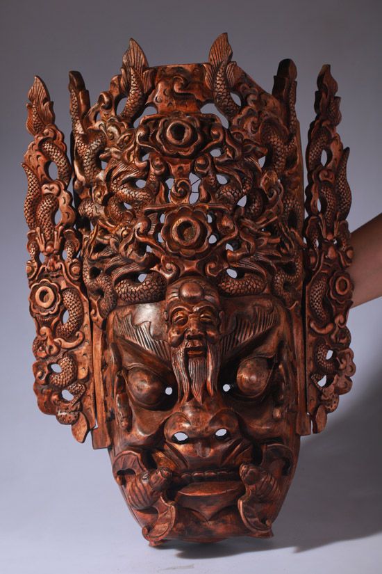 描述:程咬金,字義貞,原名咬金,后更名知節(jié)。驍勇善戰(zhàn),歷史上是唐朝開國名將,以“三板斧”的形象在民間廣為流傳。在地戲唱本《薛仁貴征東》和《薛丁山征西》中,均有程咬金的出場。根據(jù)《隋唐演義》的內(nèi)容,程咬金雖然頭腦簡單,卻是個(gè)有福之人,被認(rèn)為是福將,所以在地戲面具的刻畫上,在嘴角兩側(cè)雕刻上一堆蝙蝠,以取“福”的諧音。又因?yàn)槌桃Ы鹪谔拼闶情L壽之人,故爾額頭上刻一壽星,帶給人福壽雙全的吉祥含義。