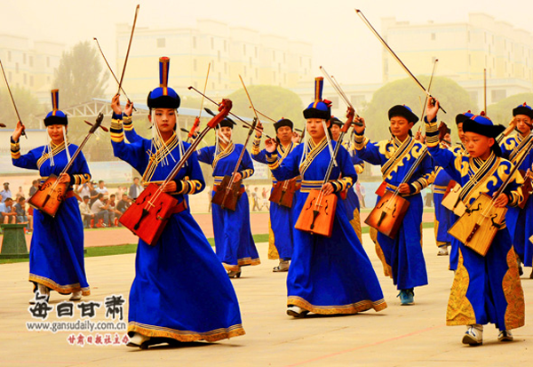 2016年8月底,肅北作為甘肅省唯一以蒙古族民族為主體的自治縣,特意承辦了八?。▍^(qū))第七屆“母語(yǔ)杯”蒙古文書(shū)法大賽作品展。在其頒獎(jiǎng)晚會(huì)上,肅北縣烏蘭牧騎登臺(tái)亮相,博得一次次熱烈的掌聲。演出節(jié)目包括:歌曲《父親的故鄉(xiāng)》《陽(yáng)光下的母親》《不會(huì)忘記》,舞蹈《筷子舞》《薩吾爾登》,馬頭琴齊奏《風(fēng)中的蘇力德》等。