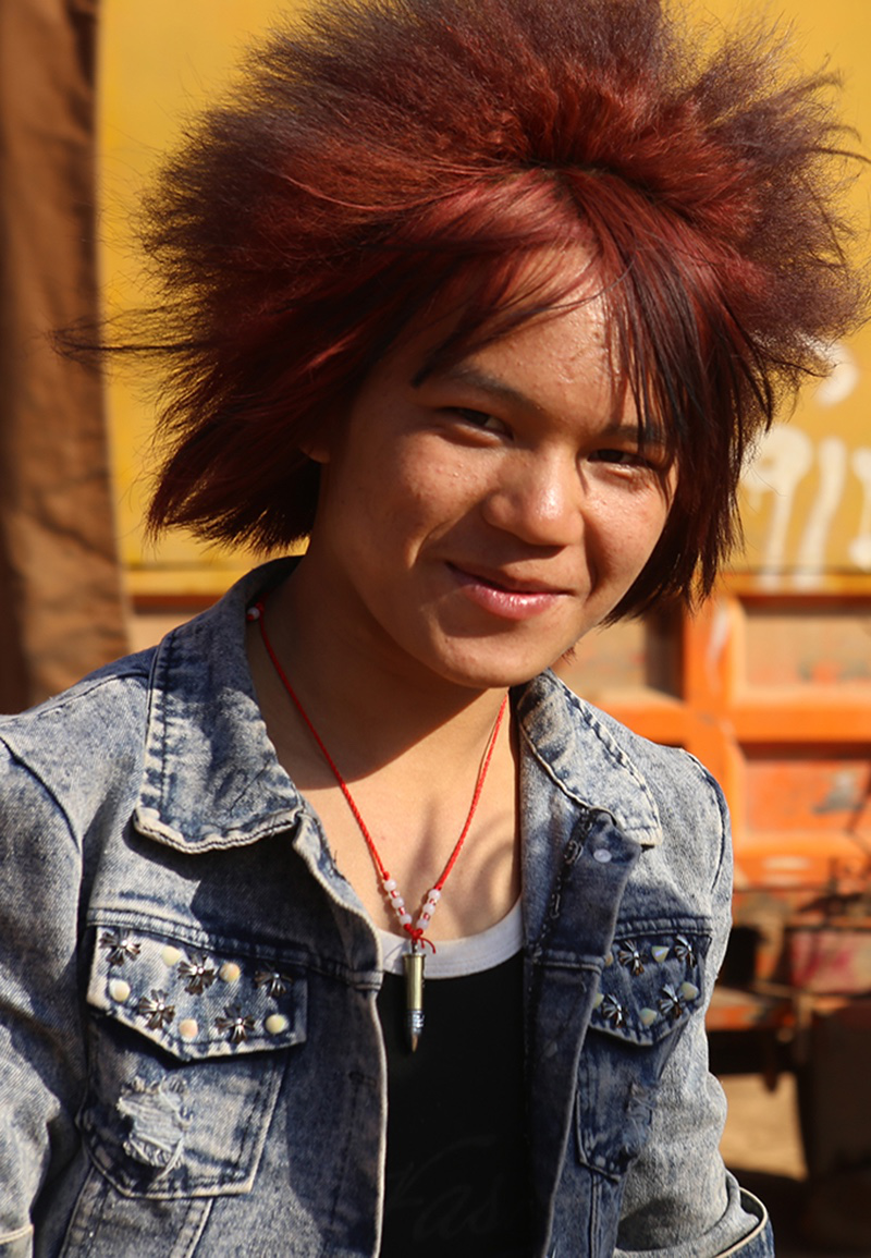 與女性不一樣,這里的男性不講究穿苗服。大多數(shù)苗族年輕男子如今都在城里打工,他們更愿意展現(xiàn)自己個(gè)性時(shí)髦的一面,印有外文字母的休閑衣服受到格外的歡迎。新潮的西服皮鞋,嬉皮的休閑牛仔,紋身,墨鏡,耳釘,項(xiàng)鏈……我發(fā)現(xiàn)幾乎所有的年輕男子都會在自己的頭發(fā)上做點(diǎn)文章,而今年的潮流似乎偏向夸張的美感。