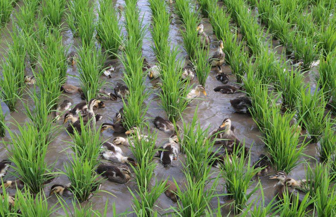 除了科技富硒外,過灣富硒米還采用了稻鴨共作的種植技術(shù)。鴨子以天然水草和水生物為食,免去除草劑的使用,直接代替人工解決了除草和除蟲。同時(shí),鴨子在稻田間游動(dòng)不僅加強(qiáng)水稻根部的空氣流動(dòng),促進(jìn)水稻的呼吸作用,同時(shí)也可以耙田濁水,促動(dòng)水田流動(dòng),疏松土壤,刺激水稻生長(zhǎng)。鴨糞落入稻田也是天然有機(jī)肥,給水稻補(bǔ)充天然養(yǎng)料。因此這種稻鴨共作的方式不僅利于環(huán)境的保護(hù),也可以在適當(dāng)提高水稻產(chǎn)量,利于鴨子的生長(zhǎng),形成有益的生態(tài)循環(huán)。