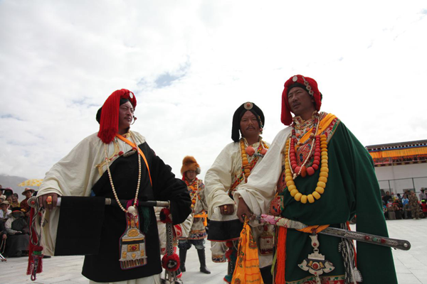 藏族分布在全國五省區(qū),因氣候、環(huán)境的不同,形成了豐富多彩的服飾文化。藏族服飾有“隔山兩個樣的”說法,有人統(tǒng)計,因地域、男女、年齡、婚否和季節(jié)的不同,藏族服飾有100多種。男裝各地大同小異,上身穿寬大的藏袍,袖長及膝。束各種腰帶。寬大的藏袍非常適應(yīng)青藏高原多變的氣候,露出右臂便于勞作,天熱時將脫掉兩袖,將藏袍扎在腰間,天冷時套上雙袖。西藏人的服飾樣式很多,有衛(wèi)藏類服飾、康巴類服飾、安多類服飾和拉薩裝。衛(wèi)藏主要指除昌都地區(qū)以外的西藏大部分地區(qū)。西藏大部分地區(qū)的男裝,主要衣料是氆氌,城鎮(zhèn)人多穿黑色,農(nóng)牧民多穿白色??蛋椭饕肝鞑氐牟己颓嗪5挠駱?、果洛一帶。男子多內(nèi)穿右襟齊臍短襖,外罩圓領(lǐng)寬袖長袍。頭戴狐皮帽或“扎秀”(發(fā)辮纏紅絲線),扎腳穿高筒靴顯得英俊瀟灑。女子穿長袖衫,外罩坎肩,腰束彩條圍裙。講究腰帶和腰刀,腰帶和腰刀上要鑲嵌金銀珠寶。女子多戴名貴飾品,顯得華麗昂貴。安多藏區(qū)主要指西藏那曲與安多縣接壤的地方。過去,男裝衣領(lǐng)、袖口,下擺多飾虎豹皮,女裝邊飾多為水獺皮,而且項、腕、手指和腰間配有金銀寶石飾物。