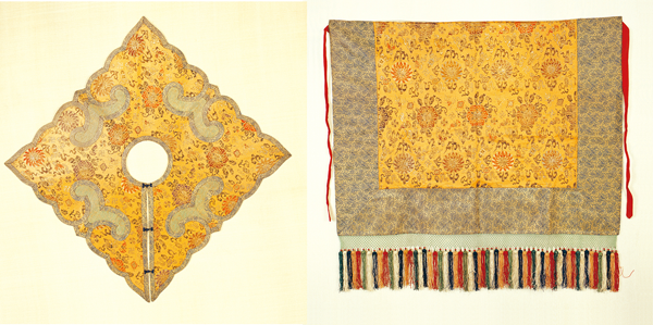 圖為清代藏傳佛教僧人法衣(桔黃地寶相花織錦披肩與織錦裙),中央民族大學民族博物館館藏