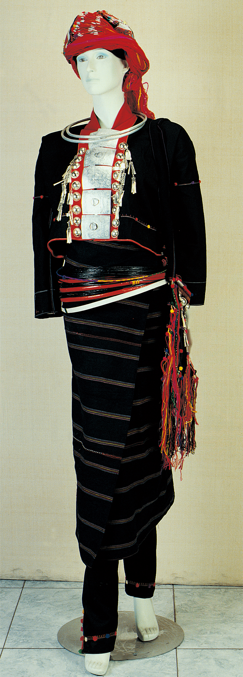 “藤篾腰箍”最醒目的是套在婦女腰間的藤蔑圈,又被稱為“腰箍”。早在德昂族的創(chuàng)世古歌中,就有“腰上箍著藤圈的姑娘靠得住”的說法,德昂族通常把佩戴腰箍的數(shù)量作為衡量姑娘心靈手巧的標(biāo)志。從清代,德昂族從古代蒲人中分化出來,劉毓坷在光緒年間的《永昌府志》卷五十七順寧府記載,崩龍族人“女以尖布套頭,以藤蔑圈纏腰,漆齒紋身”。而現(xiàn)在其他民族以藤蔑圈纏腰的習(xí)俗早已不復(fù)存在,只有德昂族的這一習(xí)俗延續(xù)至今(圖為德昂族傳統(tǒng)銀牌扣竹篾腰箍女服,中央民族大學(xué)民族博物館館藏)。