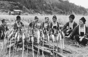 廣西三江侗族自治縣舉辦高山稻魚文化節(jié),當(dāng)?shù)氐某檀濉⒘伎?、富祿等鄉(xiāng)鎮(zhèn)以稻田抓魚、烤魚、風(fēng)情表演等活動,吸引游客前往體驗原汁原味的侗鄉(xiāng)稻魚文化,樂享金秋豐收喜悅。近年來,該縣傾力推進“種稻養(yǎng)魚”特色產(chǎn)業(yè),將傳統(tǒng)優(yōu)勢轉(zhuǎn)化為資源優(yōu)勢,并大力發(fā)展生態(tài)鄉(xiāng)村游,推銷高山生態(tài)健康食材,使群眾脫貧增收。圖為當(dāng)?shù)厣贁?shù)民族婦女在該縣富祿苗族鄉(xiāng)富祿村稻田內(nèi)烤魚。