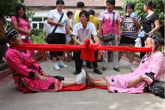 鄂倫春族特別喜歡體育活動(dòng),每當(dāng)狩獵閑暇的時(shí)候,便會(huì)開(kāi)展各項(xiàng)體育比賽活動(dòng)。兩三個(gè)人在一塊平地上,拿出一根皮繩就可以進(jìn)行跳繩比賽;在河邊撿起石頭就可以進(jìn)行投擲比賽;跳到河里又可以進(jìn)行游泳比賽。他們也很樂(lè)于進(jìn)行力的較量,摔跤,鄂倫春語(yǔ)稱“娟滴任”,這是獵人們普遍喜愛(ài)的一項(xiàng)運(yùn)動(dòng),常勝者會(huì)贏得人們的贊賞和姑娘的青睞。還有一種較力比賽,鄂倫春語(yǔ)稱“譚滴任”,俗稱“拽棍”。兩人相對(duì)坐在地上,雙手緊握一根約半米長(zhǎng)的木棍,雙腳平伸雙足相抵。比賽開(kāi)始,雙方拼力拽拉木棍,將對(duì)方拉起來(lái)為勝。