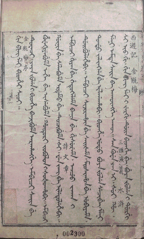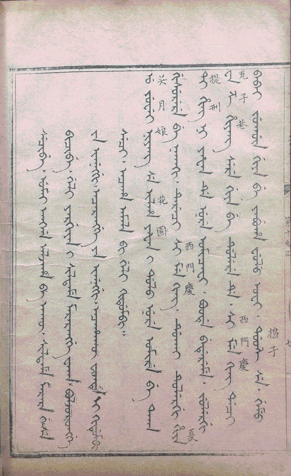 滿文本《金瓶梅》國內(nèi)藏有國家圖書館刊本、中央民族大學(xué)圖書館刊本、趙則誠先生藏刊本(殘)、中國社科院民族研究所刊本(殘)、大連圖書館抄本、吉林大學(xué)圖書館精抄本、中國民族圖書館刻本等。此外北平闞君云敝處所藏有蒙文《金瓶梅》。