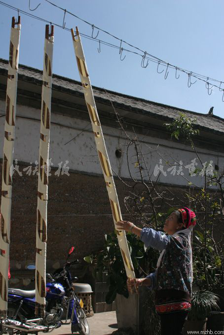 小心地將竹桿架子拿到室外的太陽(yáng)下掛好