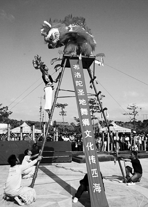 獅子過天橋、刀尖獅技、高樁飛獅……一只只威風凜凜的“獅子”在高臺或梅花樁上騰挪跳躍,它們時而回首擺尾,時而單腿直立,時而臥居山川,時而沖向九霄,甚至還會沖觀眾眨眼吐舌,憨態(tài)可掬,惟妙惟肖。整個場面既驚險又有趣,讓大批駐足觀看的游客大開眼界……