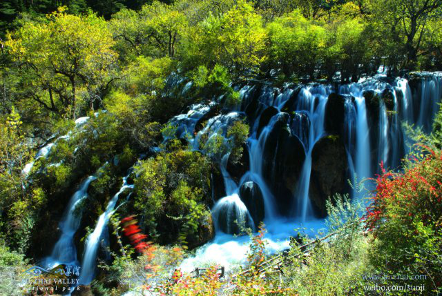 九寨溝四周群山聳峙,有雪峰數(shù)十座,高插云霄,終年白雪皚皚。河谷地帶奇水薈萃,其間有成梯形分布的大小湖泊114個,瀑布群17個,鈣華灘流5處,泉水47眼,湍流11段,以1870米的海撥高差,在12 座雪峰之間穿林跨谷,珠連玉接,呈Y字型串珠,逶迤近60公里,形成了中國唯一、世界罕見的以高山湖泊群和瀑布群以及鈣華灘流為主體的風景名勝區(qū)。湖泊小者數(shù)平方米,最大的長海長達7公里。湖水終年碧藍澄澈,色彩斑讕,在陽光照射下,呈現(xiàn)出藍、黃、橙、綠等多種色彩,絢麗奪目。天氣晴朗時,藍天、白云、雪山、森林倒映湖中,水光浮翠,美麗如畫,并隨季節(jié)推移呈現(xiàn)出不同的色彩和風韻,有“九寨歸來不看水”之說。