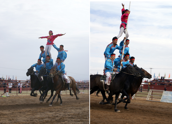 蒙古族的馬術(shù)表演非常精彩,有很多項目?!翱缭秸系K”是在運動場跑道上每隔幾十米設(shè)置一個高1米的跨欄。跑道終端立著一個直徑約2米的火圈,矯健的坐騎從起跑線踏蹄起跑,越過跨欄,鉆過火圈直達終點?!俺笋R斬劈”是在200-250米的距離之間樹起十幾個目標。騎手們手持馬刀,疾馳如飛,經(jīng)過一個個目標時舉刀劈砍,刀起標落。“馬上技巧”是由運動員們在飛馳的馬背上做出各種造型動作。運動員一般八九歲就要在馬術(shù)隊接受嚴格的訓練。技巧表演可分單項和多項,其中又包括單人單馬、單人雙馬、雙人雙馬和多人多馬。一匹飛奔的馬經(jīng)過騎手身邊,騎手可以突然抓住馬鬃翻身上馬,又會突然下馬腳尖點地再躍上馬背。其他技巧還有在馬背上“空翻倒立”“側(cè)方隱蔽”“樓里藏身”以及驚險的“馬上疊羅漢”等表演【如圖,劉軍攝影,編者修剪合成兩圖】。