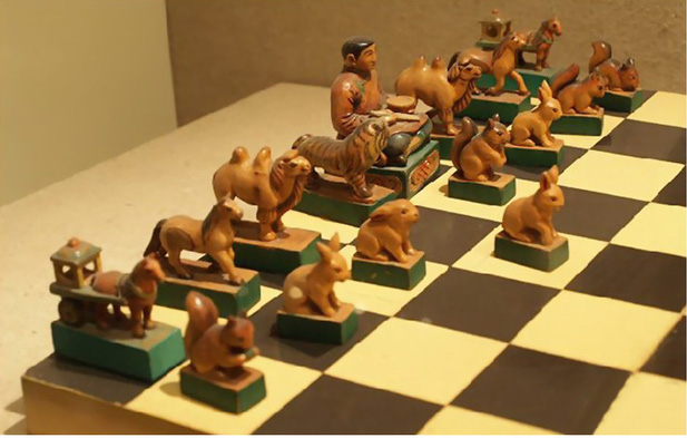 據(jù)清葉明澧《橋西雜記》載,蒙古象棋的棋制和著法乃:“局縱橫九線,六十四卦。棋各十六枚:八卒、二車、二馬、二象、一炮、一將,別以朱墨,將居中之右,炮居中之左,車,馬、象左右列,卒橫于前,棋局無河界,滿局可行,所謂隨水草以為畜牧也。其棋形而不字,將刻塔,崇象教也。象改駝或熊,迤北無象也。卒直行一卦至底,斜角食敵之在前者,去而復返,用同于車,嘉有功也。馬橫行六卦,駝可斜行八卦,因沙漠之地,駝行疾于馬也。車行直線,進退自由。群子環(huán)擊一塔,無路可出。始為敗北”【劉軍供圖】。