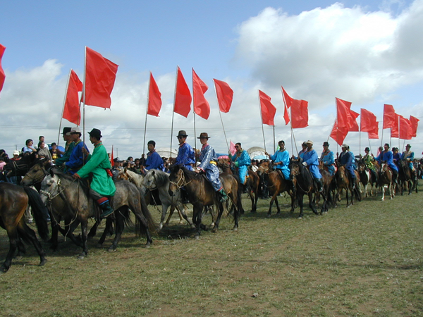 蒙古民族幾乎人人都天生酷愛馬,也很會訓練馬,若在過去,作為馬背民族更是離不開馬。好馬、好騎手一直享有極高的榮譽。因此,賽馬當然成為牧民最喜愛的運動。蒙古族賽馬一般分賽走馬和賽奔馬兩種。賽走馬是指讓鞍具齊全并釘有合適馬掌的馬跑對側(cè)步(即前后蹄一順交錯前進),比馬的速度、耐力、穩(wěn)健和美觀。有豐富經(jīng)驗者才能騎出走馬來,所以,參賽的馬多用5歲以上的成年馬,騎手也以成年人為主。比賽時,要求騎手有高超的騎術(shù),能夠駕馭好馬,使其既走得快、穩(wěn)、美,又不能跑起來。還要求馬抬步越高越好,這樣顯得很有“風度”,這不僅取決于馬掌的重量,還要看馬的素質(zhì)。一匹好的走馬,即便在牧區(qū)也價格非常昂貴。賽奔馬是比馬的速度和耐力,以先到達終點者為勝。奔馬的步伐與走馬不同,是四蹄分前后成雙交錯奔跑。參賽的選手多為十二三歲的小男孩,因為他們體輕敏捷。為了減輕馬的負荷和照顧騎手的安全,奔馬都不備鞍具或配備輕巧的鞍具。騎手們只穿華麗的彩衣,頭束紅綠飄帶,顯得英武、神氣。賽程一般長25至35千米。奔馬賽比走馬賽普遍,參賽的人數(shù)也多,少則幾十,多則逾百。比賽開始,選手們迅速躍馬,揚鞭飛奔,觀眾則雀躍歡呼,吶喊助威【圖為馬隊進場儀式,劉軍攝影】。