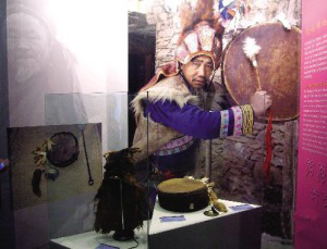 在民族文化宮的展覽中,有一幅大照片——一位老釋比,手拿羊皮鼓,頭戴猴皮帽,表情莊嚴(yán)、凝重。那正是釋比傳人朱金龍。朱金龍這次也來(lái)到了北京,把他祖祖輩輩傳下來(lái)的釋比文化展現(xiàn)給北京的觀(guān)眾。