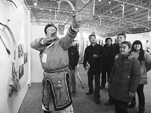 日前,在北京舉行的非遺生產(chǎn)性保護(hù)成果大展上,幾名觀眾圍攏在一個(gè)身材魁梧的錫伯族老人周圍,但見他身罩長袍,足踏薄底靴,雙目圓睜,兩臂運(yùn)力搭弓上箭,儼然就是準(zhǔn)備步射的驍將。這位老人就是錫伯族傳統(tǒng)弓箭技藝傳承人伊春光,老漢手中的弓重近1公斤,是他親手制作的。
