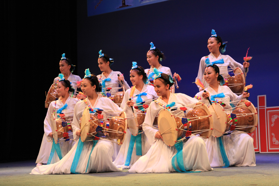 扇舞:表演者多為女性,需持花扇表演。源于古代巫女活動及民俗活動中的扇子表演,后發(fā)展成為單扇舞、雙扇舞兩種形式。扇舞有持一把或兩把扇具的不同形式,它具有朝鮮族特有的節(jié)奏、含而不露的內(nèi)在情緒、曲線性的律動和自由自在的表演,隨著隊形的不斷變化,舞者將手中的扇具可組合成豐富多樣的圖案和造型。