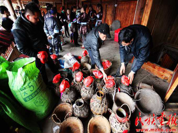 這次結(jié)婚的共有15對新人(多時(shí)有二三十對),均來自本寨的青年男女。婚禮從大年二十六開始,共進(jìn)行三天,在三天的婚禮中新郎新娘家均有婚宴,尤以第一天中午的規(guī)模最大也最為隆重。