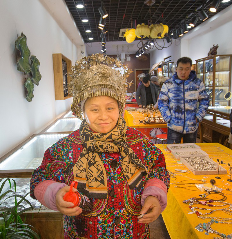 楊玉芬初到西安,是2008年來參加西部洽談會(huì)。那一次,她的苗族銀飾一天里賣了幾萬元,讓她十分驚喜。洽談會(huì)一結(jié)束,她一出來就直接打的,上去就問司機(jī)你們西安哪里最熱鬧啊?司機(jī)說當(dāng)然是回民街啦!她便讓司機(jī)帶著直奔回民街,下了車,就地找了個(gè)攤位就擺起貨來。沒想到兩個(gè)小時(shí)就賣了3000多元。在西安生意這么好做??!楊玉芬當(dāng)即決定不走了,鐵下心留在回民街。當(dāng)初,在滿是小吃的回民街上突然出現(xiàn)這么一個(gè)穿著苗服的女子忙來忙去賣銀飾,的確顯得很扎眼。但楊玉芬不把自己當(dāng)外人,很快融入了回民街,生意如同芝麻開花節(jié)節(jié)高,賣的品種越來越多,掙的錢也越來越多。她的攤位從小到大,從街邊升到室內(nèi)。去年,楊玉芬干脆在離回民街入口很近的黃金地段租了一間幾十平米的大店鋪,徹底結(jié)束“練攤”的日子,名正言順開起了“苗奶奶”銀飾店。有著上千種精美銀飾的“苗奶奶”,今天已成為坊上的一道風(fēng)景。
