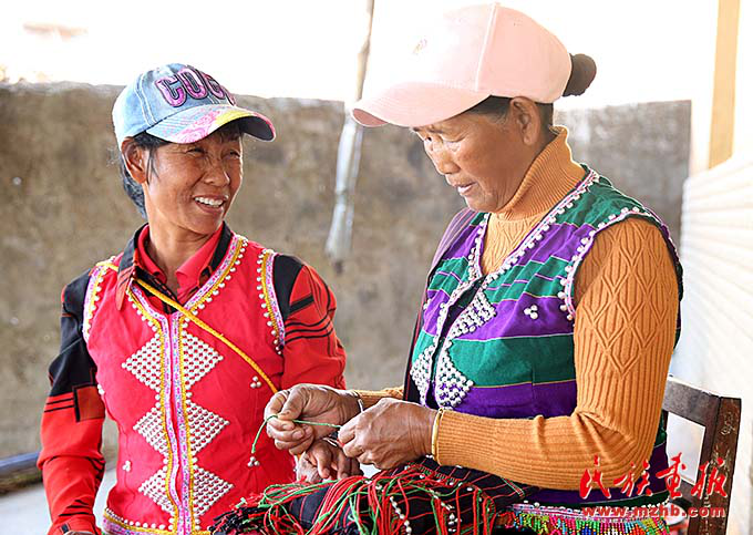 在娜巴來家,兩位表姐正在繡佤族服飾背包