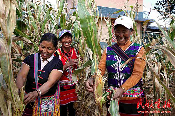 娜巴來三姐妹在苞谷地里愉快地采摘苞谷,身后就是新房子