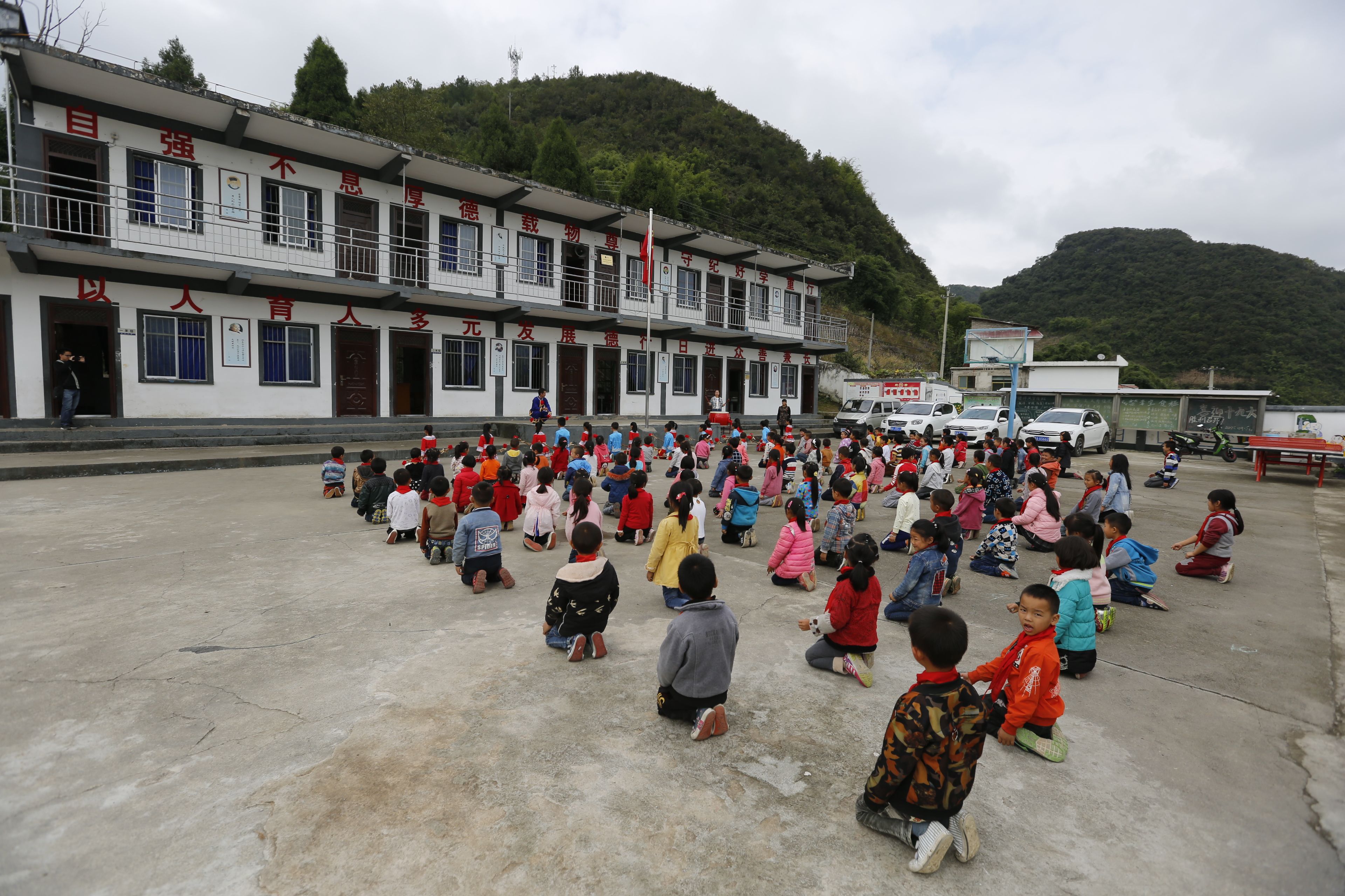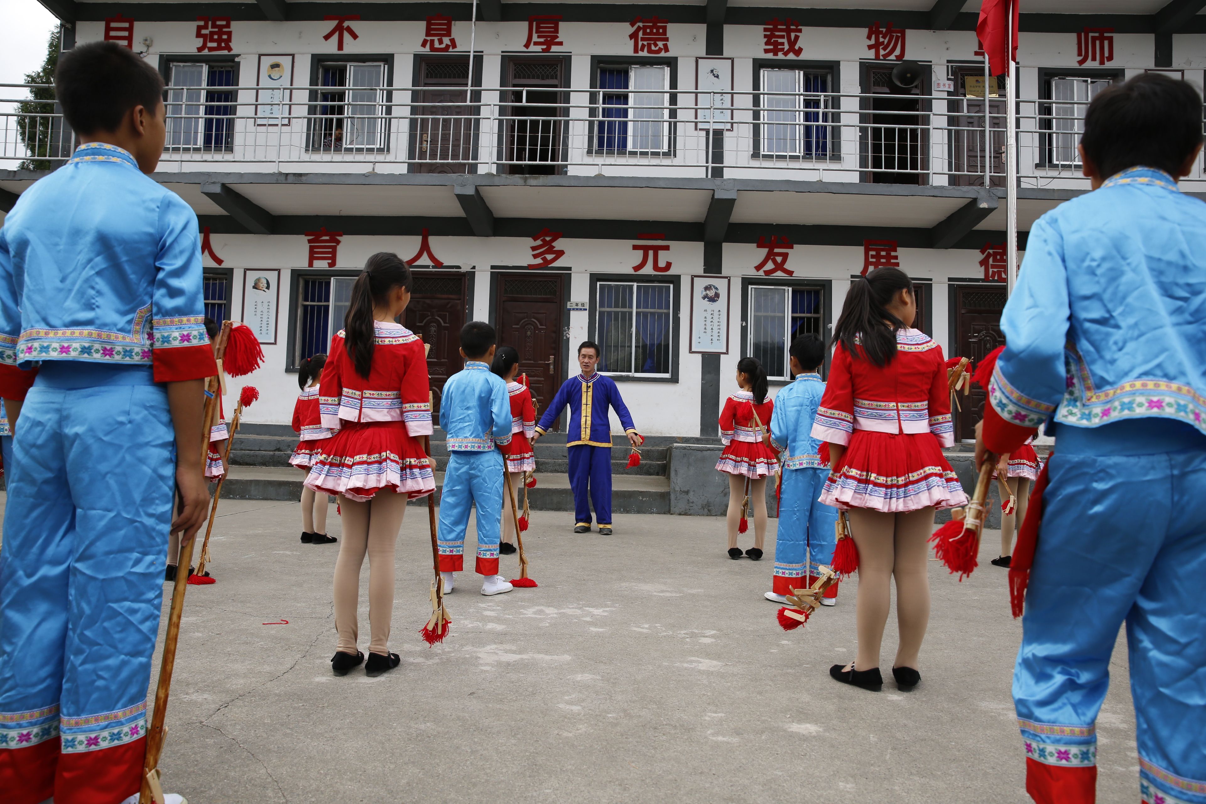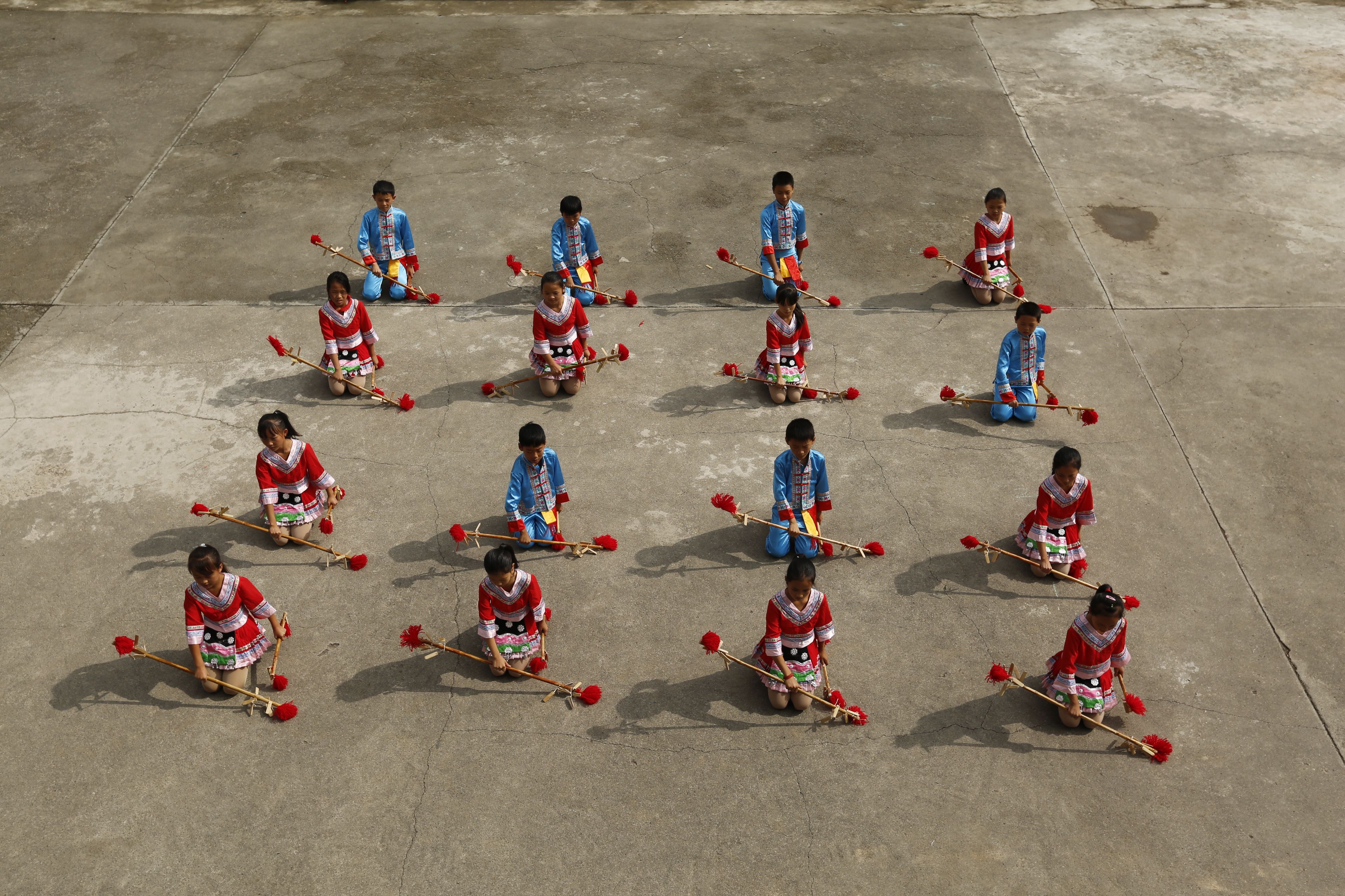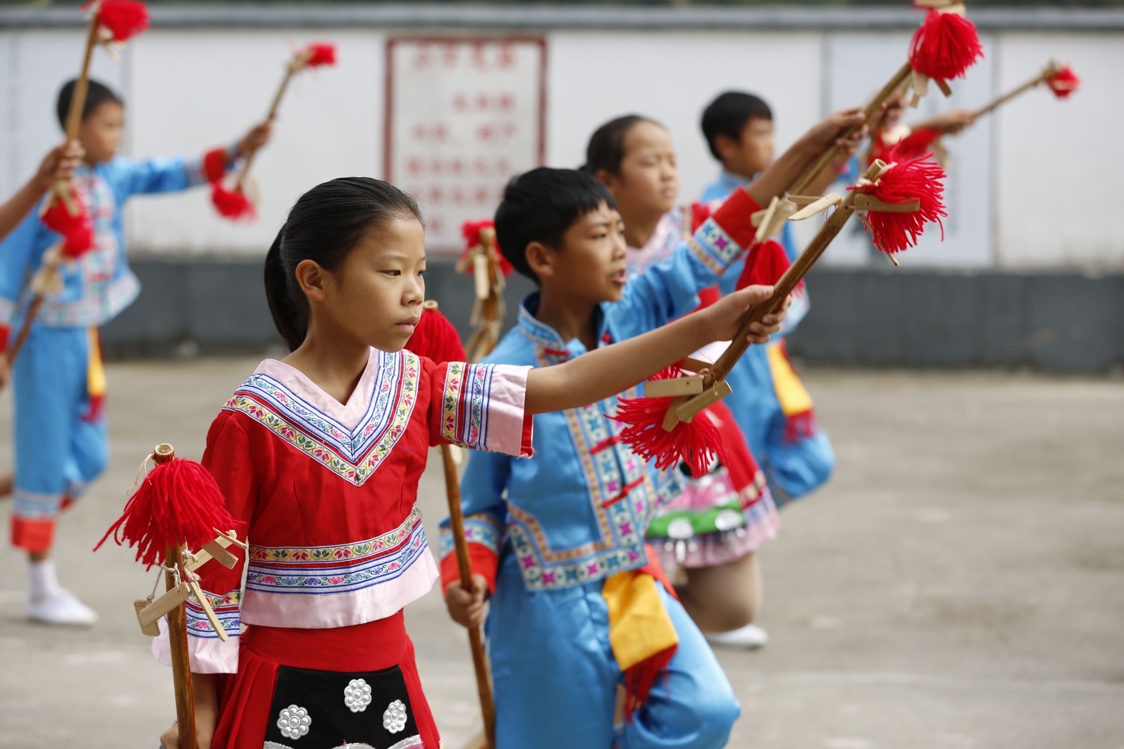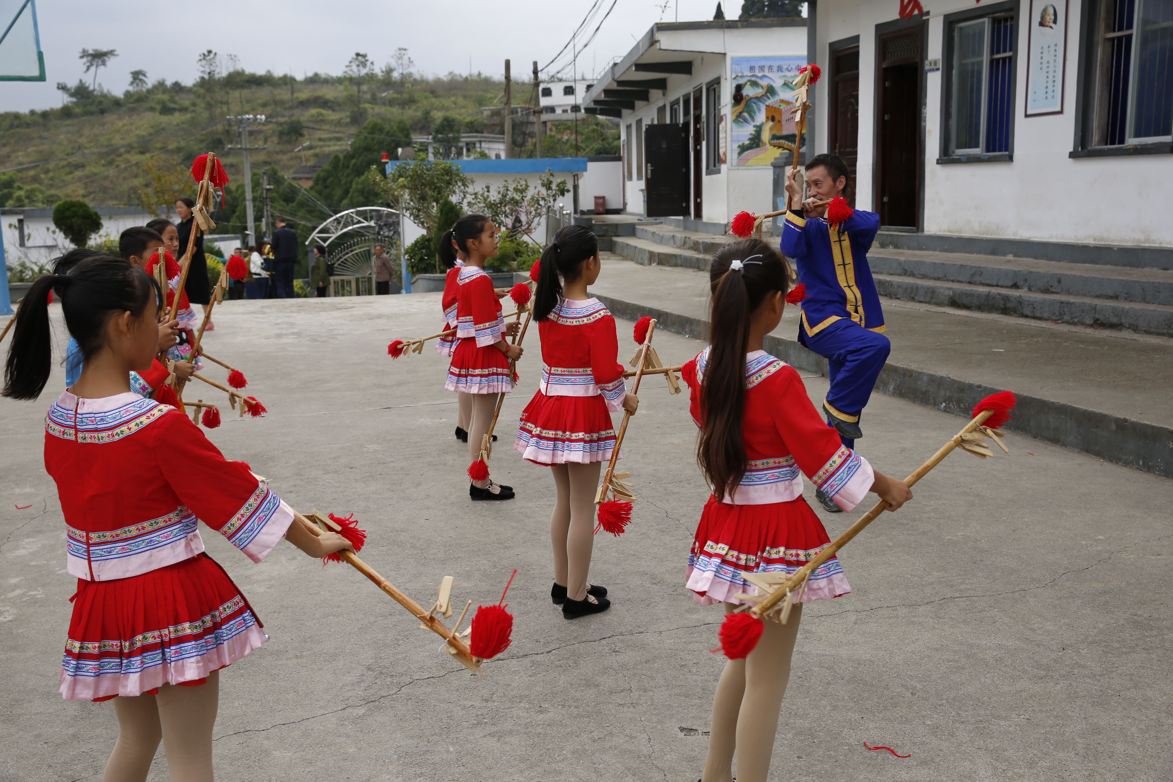 圖片說(shuō)明:貴州貴陽(yáng)苗族長(zhǎng)竹舞傳承人教孩子們跳長(zhǎng)竹舞