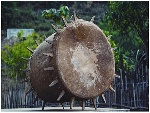 民族文化宮博物館藏基諾族木質(zhì)皮鼓,鼓面直徑55厘米,高88厘米,長(zhǎng)約130厘米,20世紀(jì)八十年代征集于云南省西雙版納州景洪縣基諾鄉(xiāng)。鼓身為木質(zhì),呈圓柱形,兩端對(duì)稱。鼓有兩面,用牛皮蒙制。兩端鼓面邊緣各環(huán)繞嵌有花紋的上方下錐形的木棍(一側(cè)17根,另一側(cè)為20根),木棍長(zhǎng)15厘米。鼓身兩側(cè)有方形孔,為鼓的音孔,上部有兩個(gè)把手,用于系繩懸掛木鼓。因鼓面兩端邊沿嵌有數(shù)十根鼓釘,形似太陽(yáng)放射出的光芒,也稱為“太陽(yáng)鼓”。