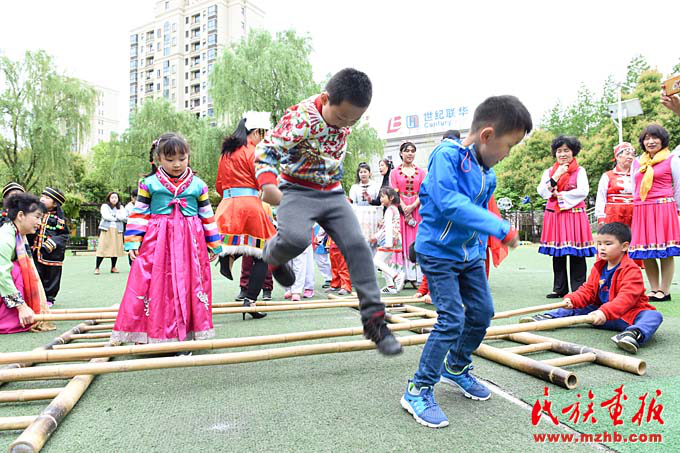 畬族的“摘柿子”、維吾爾族的“賽馬”、黎族的“跳竹竿”、蒙古族的“射箭”……天恒名都幼兒園的操場(chǎng)上,孩子們正積極參加各種民族游戲活動(dòng),沉浸在無(wú)憂無(wú)慮的快樂中。4月13日,是上海市莘莊工業(yè)園區(qū)天恒名都幼兒園的“民族接力棒小社團(tuán)”活動(dòng)日,孩子們非常期盼這每周一次的活動(dòng)日。