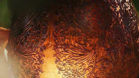 制作師傅對著一個(gè)約半米寬的“工作間”,頭頂點(diǎn)上一盞小燈,然后將待打磨的成品套在轉(zhuǎn)輪上,先用粗砂石和細(xì)砂石將釉面磨平,再用黃石、椴木細(xì)磨,直到磨出景泰藍(lán)特有的光亮。旋轉(zhuǎn)的成品和噴濺的水流構(gòu)成了一曲愉悅的勞動者之歌,就在這樣的旋轉(zhuǎn)中,景泰藍(lán)告別黯淡,周身散發(fā)出新鮮的光彩,經(jīng)鍍金工序后更顯出華貴的藝術(shù)氣質(zhì)。