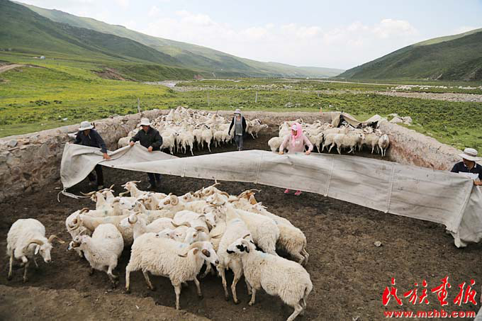 為響應(yīng)退牧還草政策,海晏縣哈勒景村的蒙古族牧民改變過去逐水草而居的生活,通過禁牧、以草定畜等措施改變草原生態(tài)。海云一家將羊群驅(qū)趕到一起為羊接種疫苗(陳濤 攝影)