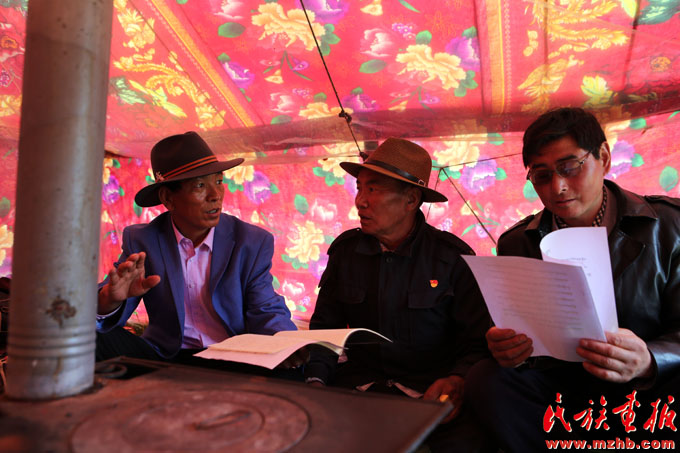 土旦(左)入戶向牧民宣傳草原法律法規(guī)和國家相關(guān)草原保護政策(黃若天 攝影)