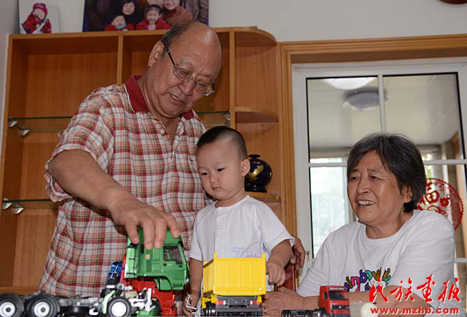 畢大寧與老伴陪小孫子玩車模,這是他們最開心的事(陳濤 攝影)