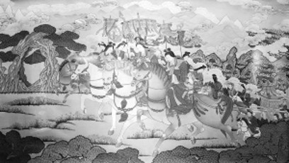 《文成公主進藏》及其細部。規(guī)格:100厘米×60厘米,創(chuàng)作時間:1985-1993年,作者:夏吾才郎、更登達吉。這幅作品由夏吾才郎構(gòu)圖,更登達吉及徒弟上色完成。整幅作品生動寫實、布局嚴謹、色彩淡雅、遠近相應(yīng),呈現(xiàn)出廣泛的視覺空間。 解加馨于供圖