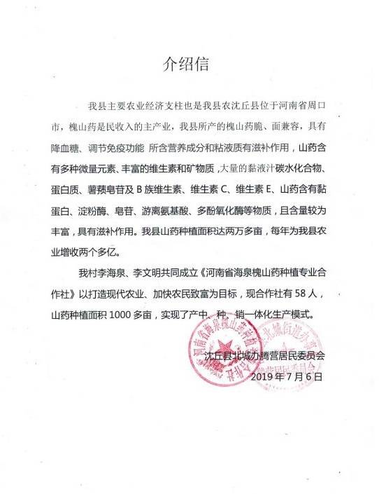 因為“槐三寶”的效益明顯,合作社于2013年成立之初吸納社員102戶,種植面積達1000多畝。2014年5月,“槐三寶”商標順利通過國家農業(yè)部無公害農產品認證和無公害農產品標識使用權,基地獲河南省農業(yè)廳無公害農產品產地認定。發(fā)展到現(xiàn)目前,2019年,其種植面積已經(jīng)超過4000畝,產量在5500噸以上。據(jù)合作社監(jiān)事李文明講:“今年沒澇,現(xiàn)在七月,山藥快成熟了,可以預見,是個豐收年。”