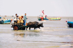 疍家漁民在海上用牛車運(yùn)送漁獲漁具(2013年攝)。