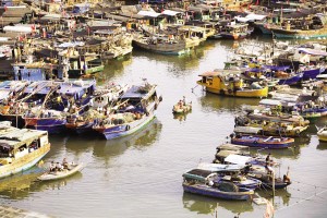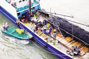小快船靠上捕魚(yú)歸來(lái)的大漁船,收購(gòu)、轉(zhuǎn)運(yùn)海鮮漁獲(2014年攝)。