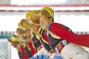 在西藏昌都市芒康縣,眾多演員同臺獻(xiàn)藝,表演國家級非物質(zhì)文化遺產(chǎn)——弦子舞。 孫非攝