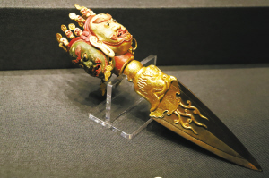 持驗法器單元主要展示修持佛法、舉行佛事活動和佛教儀式時所用的法器,包括金剛鈴、金剛杵、嘎巴拉碗、嘎巴拉鼓、嘎巴拉念珠、喀章嘎、金剛橛、鉞刀等。本部分所選法器多為藏傳佛教密宗修行所用,因多存于庫房,已不在原佛堂陳設,其用途和使用場所便難以知悉。故宮中有許多佛堂,大多是乾隆時期建造,其中很多是密宗佛堂,如雨花閣、梵華樓、梵宗樓、養(yǎng)心殿西暖閣佛堂等。