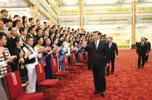 演出開(kāi)始前,習(xí)近平等黨和國(guó)家領(lǐng)導(dǎo)人會(huì)見(jiàn)了文藝會(huì)演演職人員代表、組委會(huì)成員、56個(gè)民族的優(yōu)秀基層黨員代表等,并同他們合影留念。
