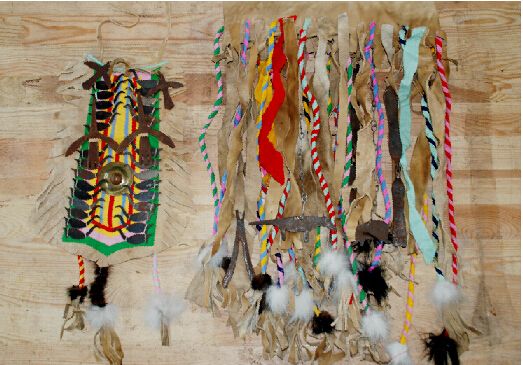 腰裙下擺的前后配戴著50個(gè)銅鈴,以此代表眾多神靈的福音。腰裙上還系著一對熊神和一對狼神偶體,因?yàn)槎鯗乜巳苏J(rèn)為熊是人類的祖先,人們不能輕易傷害獵取,如果一旦打死熊,也要對熊骨進(jìn)行風(fēng)葬。而狼據(jù)說是神靈的兒子。這些又都可見薩滿信仰又與鄂溫克人在原始社會條件下的自然崇拜、祖先崇拜有著非常緊密的淵源關(guān)系。