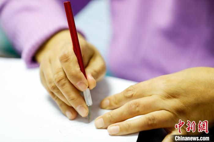 圖為河北省大廠民間刻紙藝人張翠梅正在創(chuàng)作冬奧主題刻紙作品?!⒘痢z