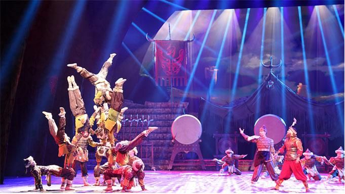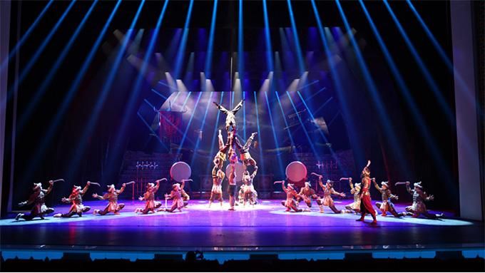雜技是這部劇的一大亮點。新疆生產(chǎn)建設兵團雜技團近年來編創(chuàng)了《天鵝湖—男子倒立技巧》《向太陽—繩技》《春之韻—女子造型》等多個精品節(jié)目,并在國內(nèi)外重大雜技賽場多次獲獎。《樓蘭尋夢》中,主創(chuàng)團隊將這些獲獎節(jié)目進行拆解,將蹬鼓、獨輪車、吊環(huán)、肩上芭蕾、水流星及舞中幡等雜技技巧與戲劇元素相融合,讓觀眾猶如置身于黃沙漫漫的絲路古國。