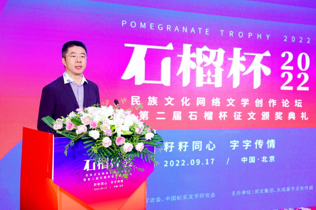 2022年9月17日,民族文化網(wǎng)絡(luò)文學(xué)創(chuàng)作論壇暨第二屆石榴杯征文頒獎活動在民族文化宮舉行。本次活動得到了國家民委所屬中國少數(shù)民族文化藝術(shù)促進(jìn)會和中國紀(jì)實(shí)文學(xué)研究會的指導(dǎo)與支持,由閱文集團(tuán)、北京天成嘉華文化傳媒主辦,天成達(dá)星國際傳媒承辦。