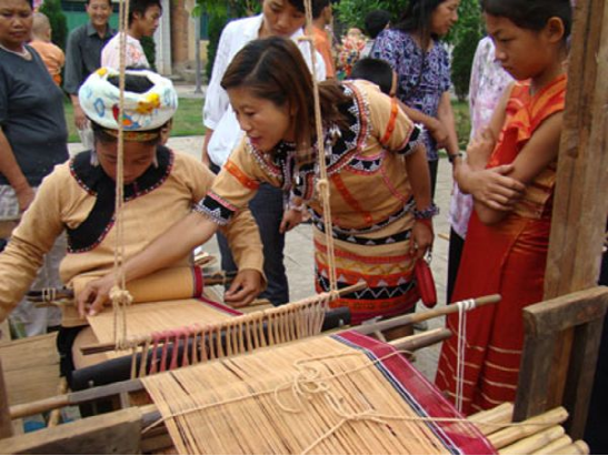 2010年上海世博會(huì)活動(dòng)周期間,一臺(tái)名為《記憶云南》的18項(xiàng)非物質(zhì)文化遺產(chǎn)展示成為最吸引眼球的亮點(diǎn)之一?;顒?dòng)現(xiàn)場(chǎng),18名云南非物質(zhì)文化遺產(chǎn)傳承人和民間藝人展示白族布扎、納西族東巴畫、傣族剪紙、傣族竹編、佤族織錦技藝等制作技藝。其間展示的佤族織錦技藝在民族文化風(fēng)情濃郁,文化底蘊(yùn)深厚的耿馬縣佤族村寨里流傳甚廣。在耿馬的佤族村寨里,婦女們一般都會(huì)紡線織布,佤族傳統(tǒng)服飾也多用自染自織的土布縫制。此地佤族傳統(tǒng)服飾按地域分為兩大類。一類是分布在耿馬鎮(zhèn)、四排山鄉(xiāng)的傳統(tǒng)服飾,以女性身著佤族紅色短衣筒裙、男子身著佤族黑衣寬褲為標(biāo)志;一類是分布在勐簡(jiǎn)鄉(xiāng)大寨村的“黃衣阿佤”服飾,以女性身著佤族黃衣筒裙、男子身著黃衣寬褲為標(biāo)志。佤族婦女所用的紡線有棉線、麻線兩種。棉主要是草棉,麻主要為苧麻和野生火麻,紡線采用內(nèi)地傳入的有紡錘的紡車。在耿馬鎮(zhèn)芒國(guó)村芒俄村民小組等佤族聚居村寨,筆者先后目睹了佤族織錦的全過程。只見紡織 中的佤族婦女一個(gè)個(gè)端坐在紡車前,凝神專注地操持著手中的活計(jì)。她們左手持麻,右手持紡錘,將紡錘放在大腿上一搓,紡錘轉(zhuǎn)動(dòng)起來(lái)后,把麻纖維慢慢從左手拉出并捻成線,紡好一截線便將它繞到小竹棍上。如此這般不停地左右穿梭,又不斷地再搓、再捻,紡出的布匹紋理細(xì)密、結(jié)實(shí)挺拔。耿馬四排山鄉(xiāng)織錦的佤族婦女,大多采用一套竹木制的很原始的腰機(jī),前后上下共有十七個(gè)零件。紡線時(shí),她們將線的一頭栓在婦女腰上,另一頭用木棍穿好,擱在織布處釘在地上的兩根木樁上??棔r(shí)兩頭繃緊,將繞在木棍上的緯線穿到經(jīng)線的中間,然后用抒刀把線打緊。這種織法節(jié)奏雖然慢一些,但織出的布更加厚實(shí)緊繃,適用于紡織粗布和麻袋。在勐簡(jiǎn)鄉(xiāng)大寨村的穿“黃衣”的佤族婦女,用黃土、玉米粉、茶葉、小飯豆、欖樹皮等7種植物做原料浸染的黃色棉線織錦,使用的有竹木制腰機(jī)和紡錘紡車兩種??楀\時(shí),只見她們一邊捻線,一邊傳遞紡錘。不織時(shí),又把紡錘和抒刀拆下,依然卷起放好。來(lái)自耿馬鎮(zhèn)、四排山鄉(xiāng)、勐簡(jiǎn)鄉(xiāng)的佤族群眾介紹,中華人民共和國(guó)成立后,由于商店里賣的布料比佤族自織的布料更價(jià)廉物美,佤族人家自己紡織制作服飾的已經(jīng)不多,但是縫制麻布被和麻袋用的麻布,還是多數(shù)來(lái)源于自家紡織,尤其是佤族村寨婦女穿的裙子,也必須是自己織,不然會(huì)被人同族人恥笑為愚笨和懶惰。2009年以來(lái),每年5月中旬,耿馬都要舉辦佤族“青苗節(jié)”慶典活動(dòng)。活動(dòng)期間,該縣不僅上演豐富多彩的文藝節(jié)目和民間體育比賽項(xiàng)目,還現(xiàn)場(chǎng)展示該縣獨(dú)具特色的佤族織錦技術(shù)??楀\展示中,來(lái)賓增長(zhǎng)了對(duì)佤族傳統(tǒng)手工技藝方面的知識(shí),不少圍觀群眾還饒有興趣地一邊詢問織錦者,一邊親自動(dòng)手體驗(yàn)這項(xiàng)古老而傳統(tǒng)的紡織技藝。
